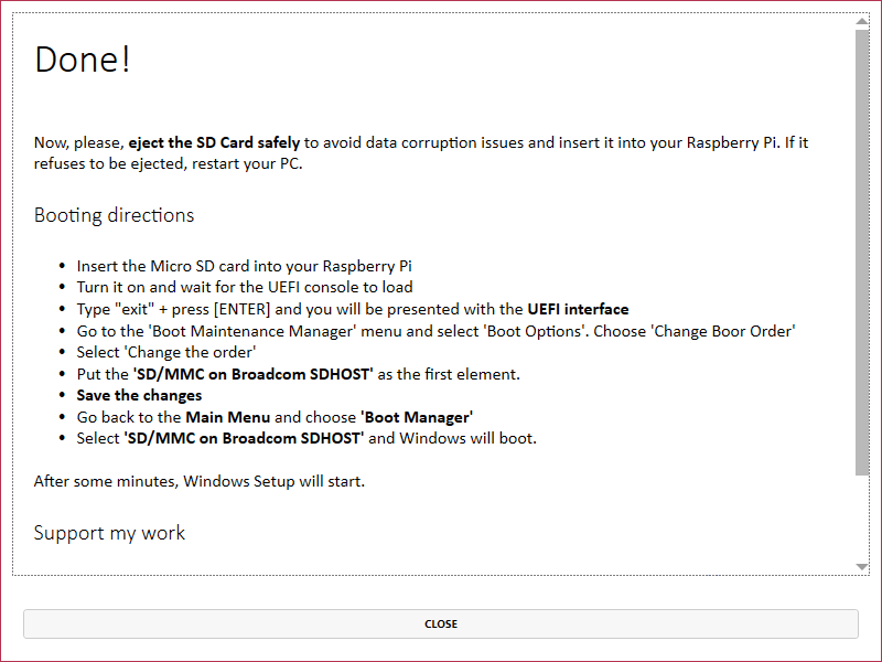 • Select 'SD/MMC on Broadcom SDHOST' and Windows will boot.