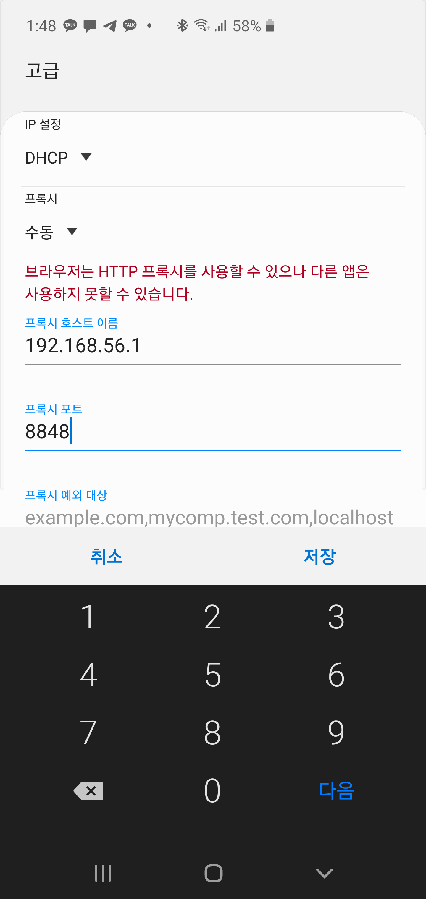 6. 지금 보이는 주소로 스마트폰에서 HTTP 프록시를 설정합니다.
