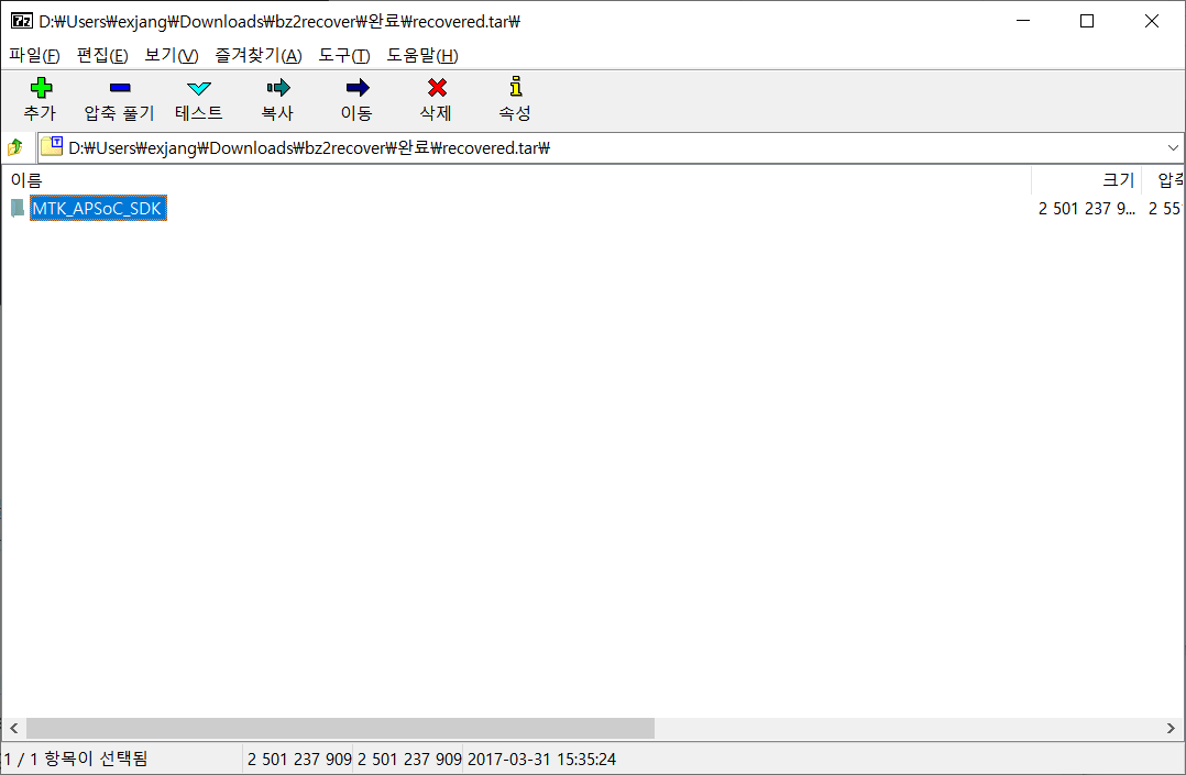 이제 해당 파일은 정상적으로 열리고 아까 예시에서의 사진 한 장(저는 아주 큰 파일이었지만..)을 제외한 나머지 파일을 압축 해제하실 수 있습니다.