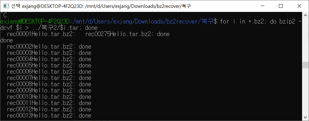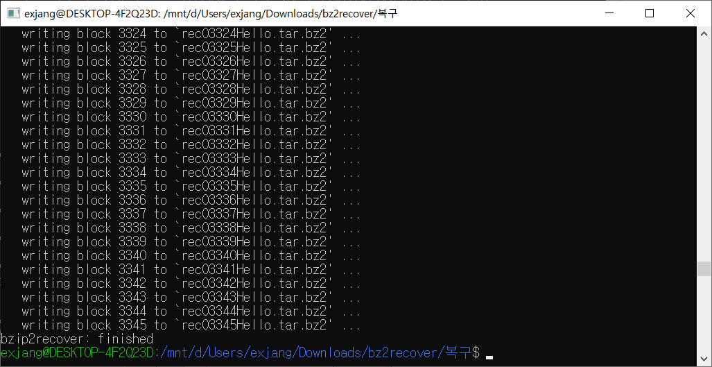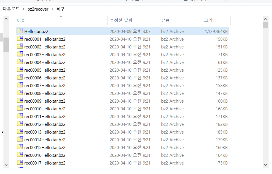 bzip2recover 명령을 사용해 깨진 압축 폴더를 복원해 보겠습니다.