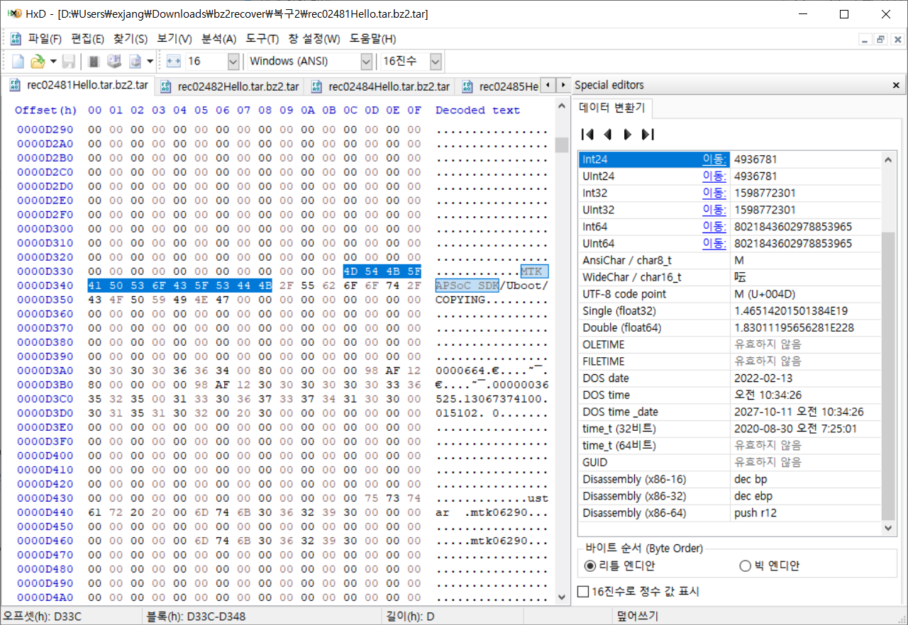 선행 헤더를 찾기 위해 앞쪽 파일을 차례대로 짚어가며 HEX 에디터로 열어서 헤더를 찾으면 됩니다.