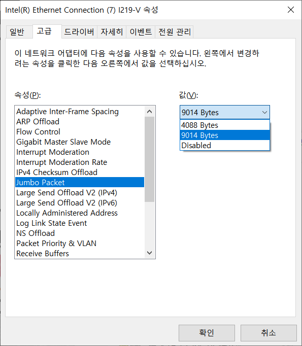 위 결과는 네트워크 어댑터의 Jumbo Packet 설정을 Disabled로 두고 측정한 결과입니다.