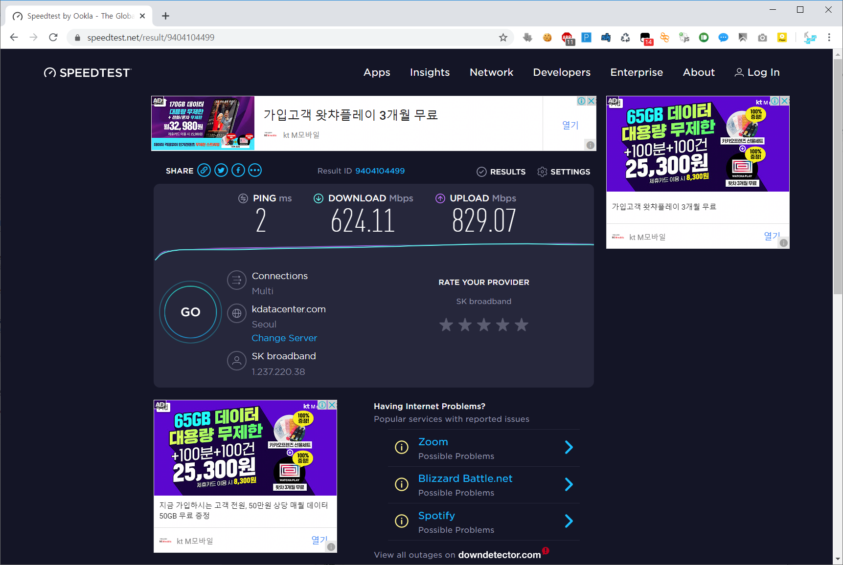 실제로 켠 상태와 끈 상태의 속도를 비교해 봤습니다.