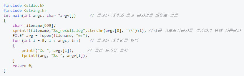 실행되면 자신이 받은 매개 변수 옵션을 그대로 파일로 출력하는 프로그램을 만들어 봤습니다.