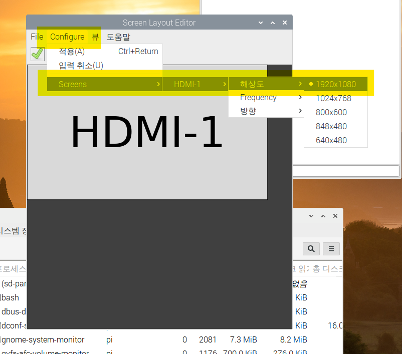상단의 Configure 메뉴에서 Screens -> HDMI-1 -> 해상도(Resolution) -> 원하는 해상도를 선택해줍니다.