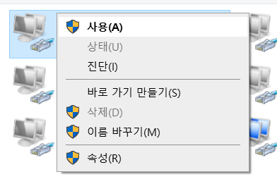 1. 문제가 발생한 이더넷 어댑터를 오른쪽 클릭해 매뉴를 열어 사용 안 함(B)을 눌러줍니다.