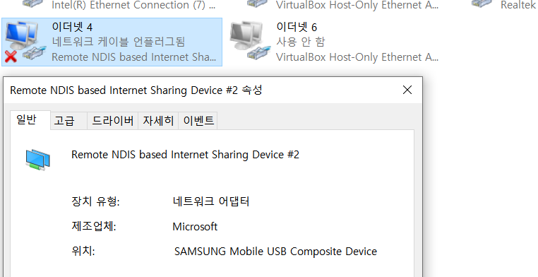 실제로 USB 케이블이 분리되면 저 문구가 뜨지 않고 이더넷 4(또는 해당 어댑터)가 통째로 목록에서 사라집니다. 이더넷 모뎀(랜카드)이 안드로이드 휴대전화 쪽에 있기 때문에 랜카드째로 분리되는 것이기 때문이죠.
