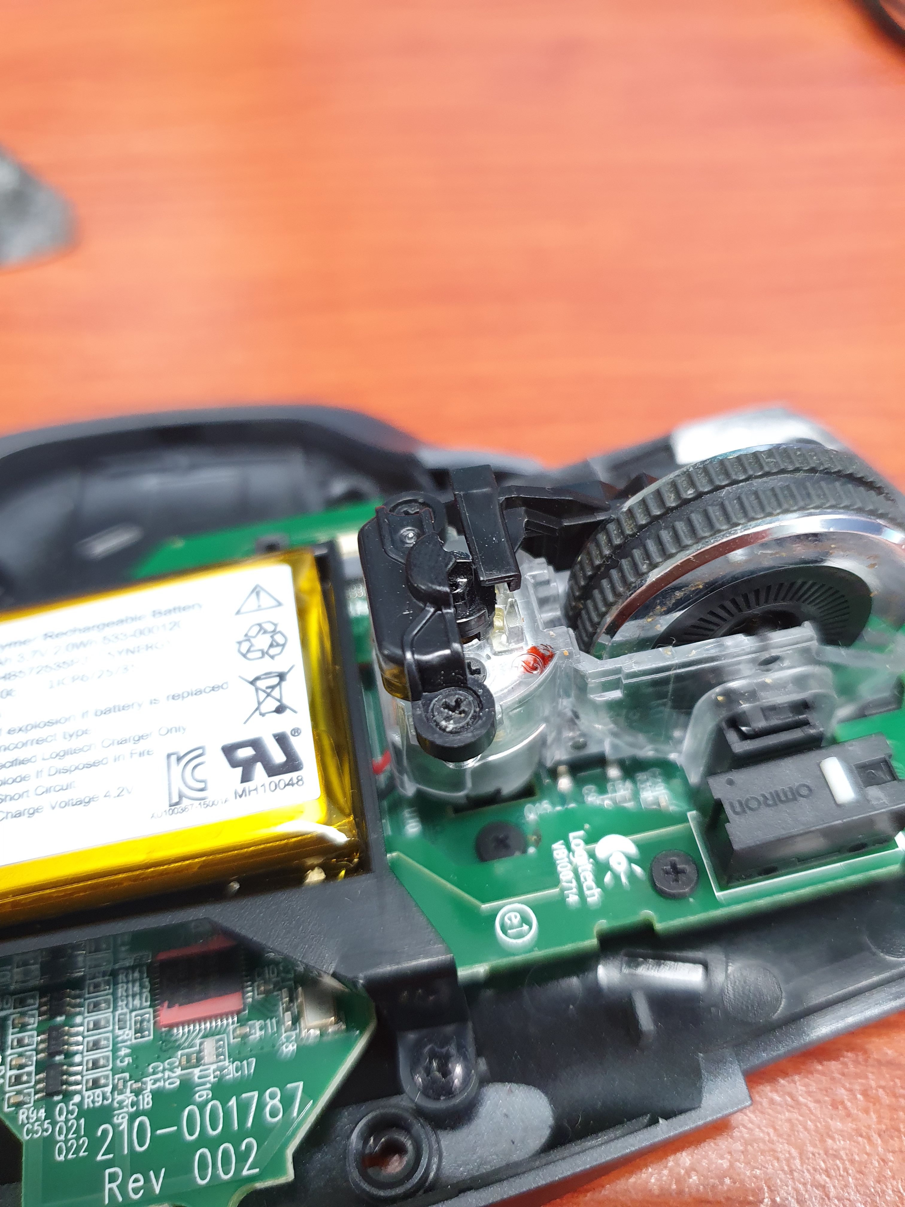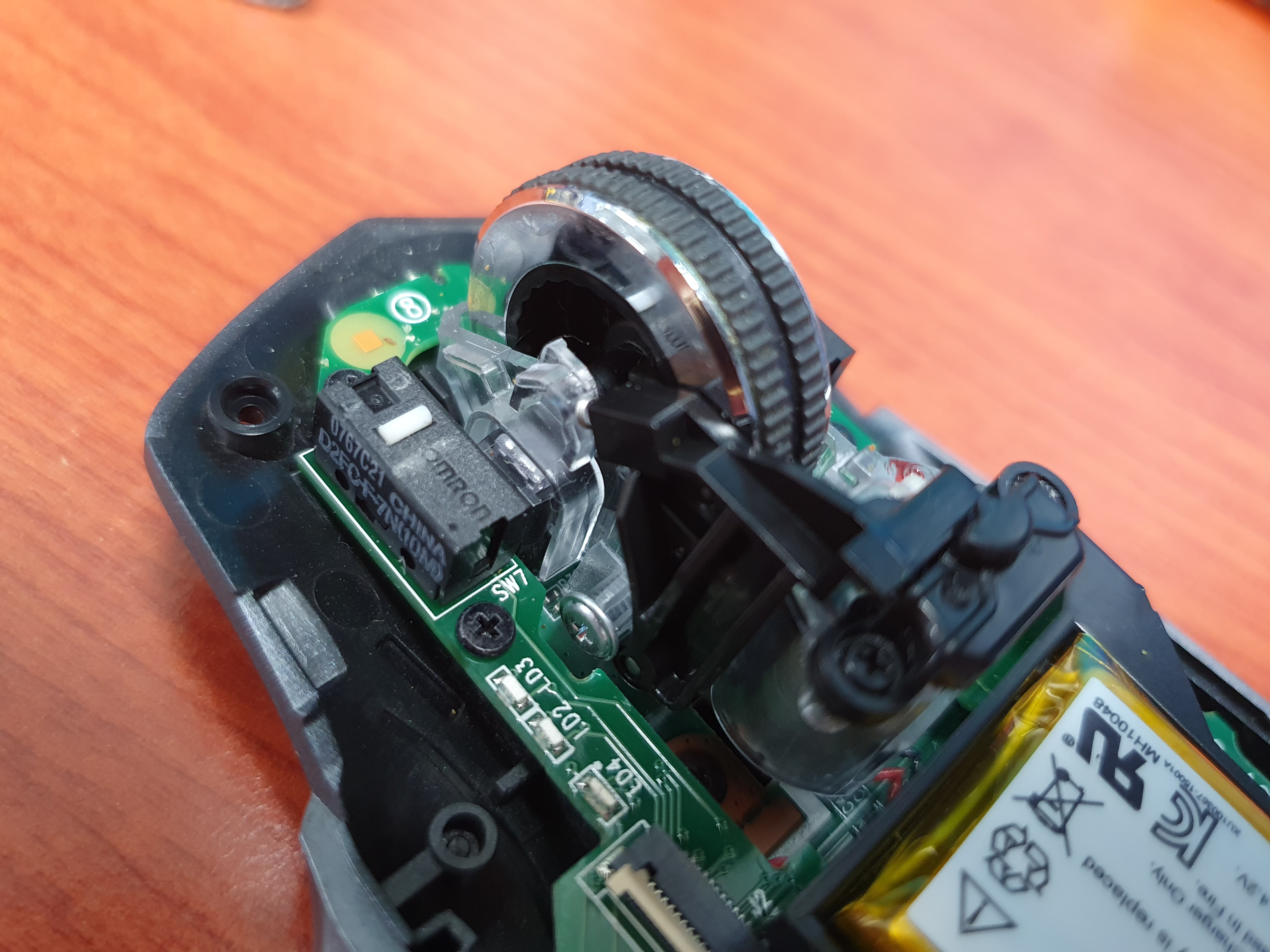 이 모터가 스크롤 휠의 레칫을 풀어줍니다. SmartShift 기능의 핵심이 되는 부품이죠.