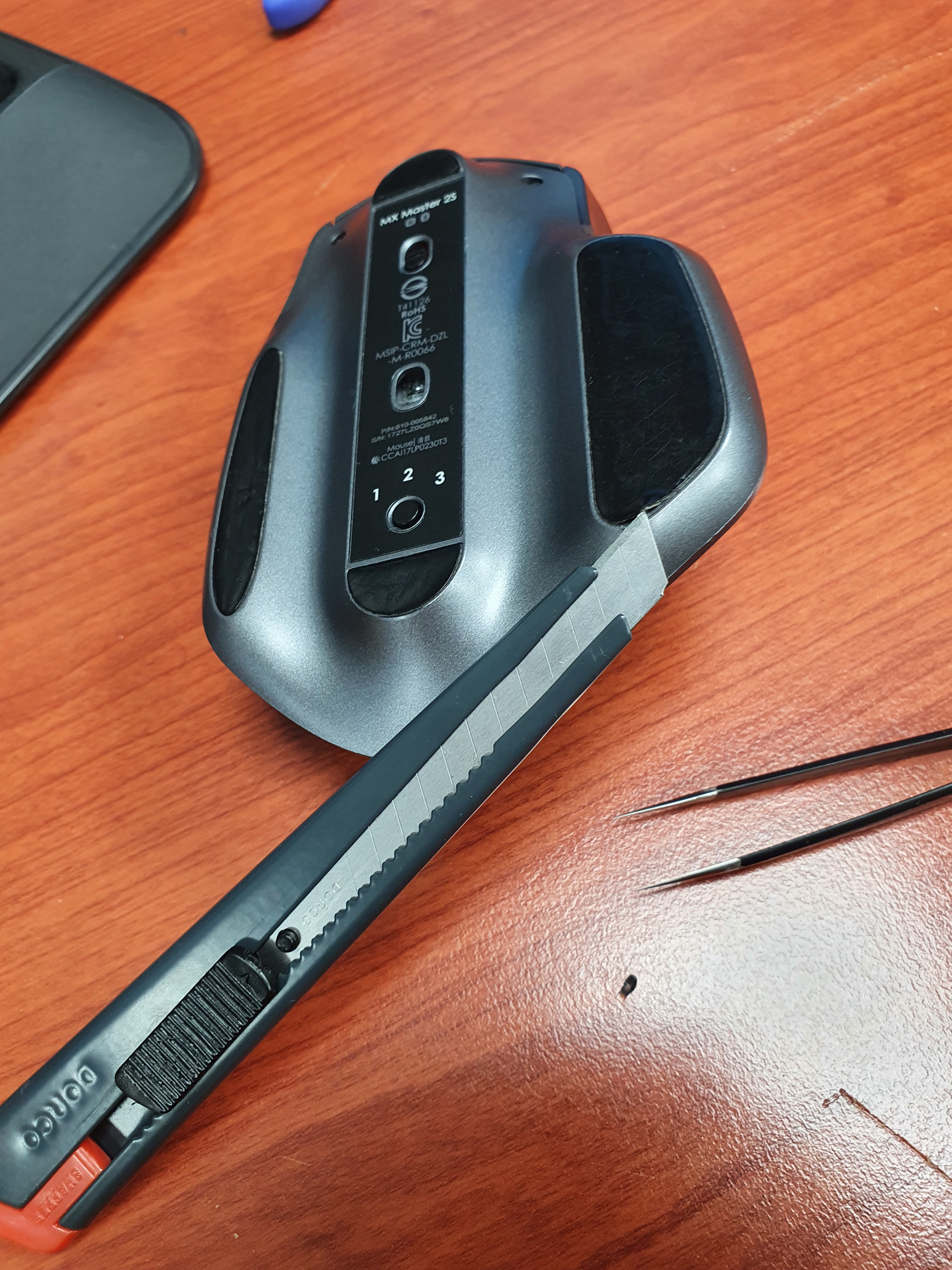 커터칼 또는 각종 도구를 사용해서 마우스 밑면 스케이트를 제거해야 합니다.