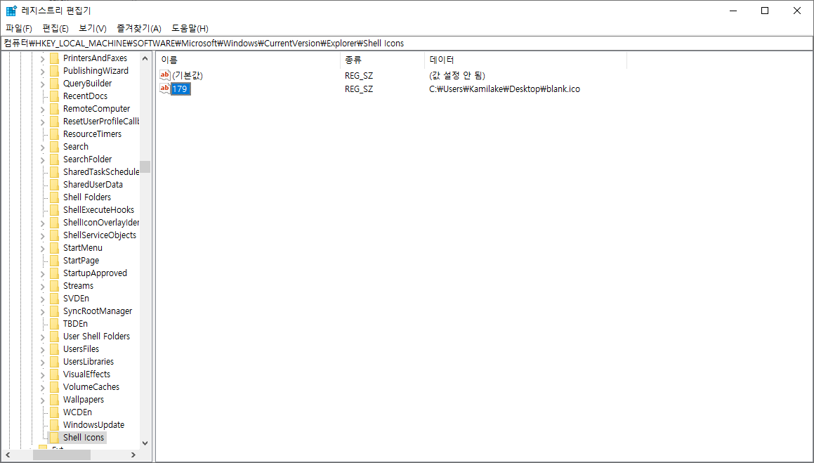 값 데이터(V) 입력란에 위에서 저장한 blank.ico 파일의 전체 경로를 지정합니다.