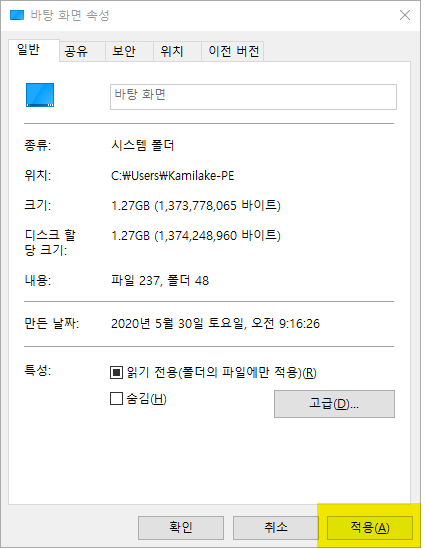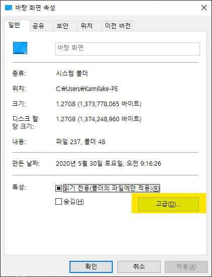 바탕 화면 속성의 일반 탭의 특성 단락에 있는 고급 버튼을 클릭합니다.
