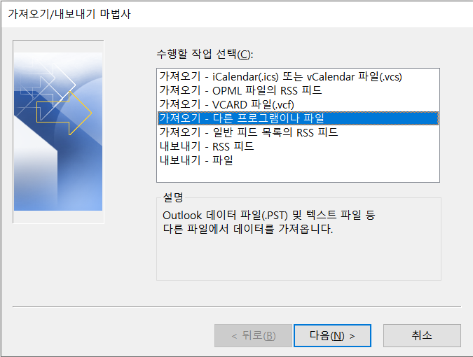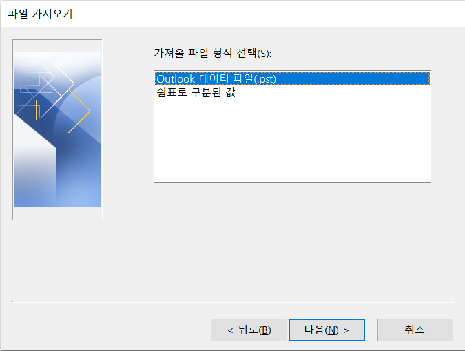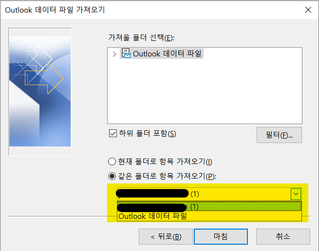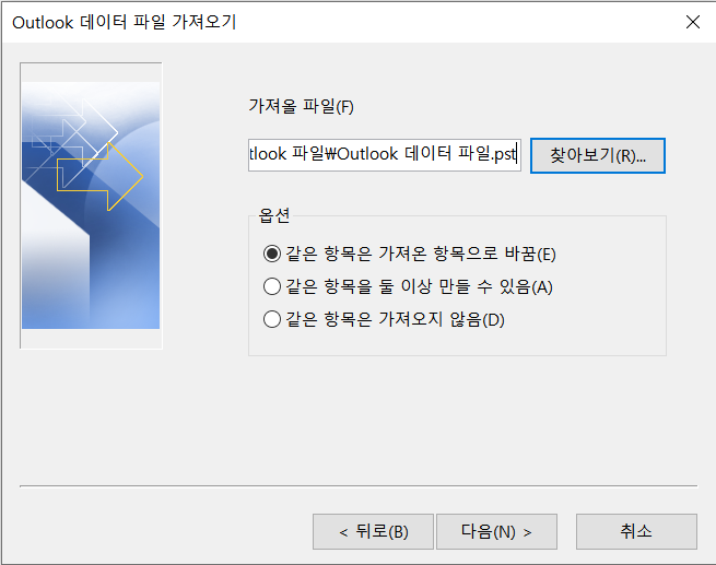 그 후 위에서 기억해 두었던 pst 파일의 경로를 사용하세요.