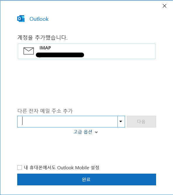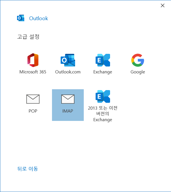 Outlook은 원래 @gmail.com으로 끝나는 계정은 자동으로 구글 API를 통해 IMAP 서버 없이도 로그인이 가능하지만 그렇지 않은 경우는 수동으로 계정을 추가해야 합니다.
