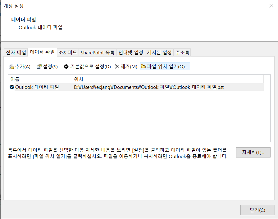 계정 설정 창의 데이터 파일 탭에서 파일 위치 열기(O) 단추를 클릭합니다.
