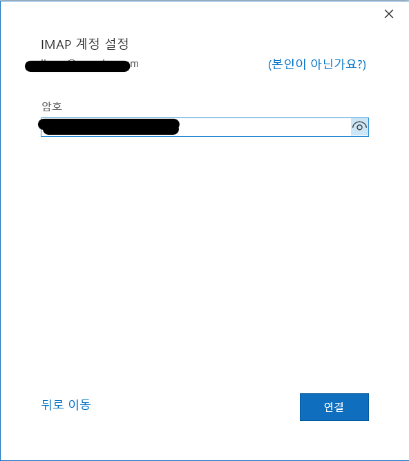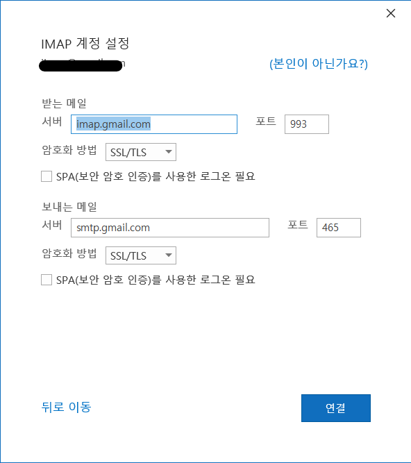 다음과 같이 IMAP 계정 정보를 입력합니다.