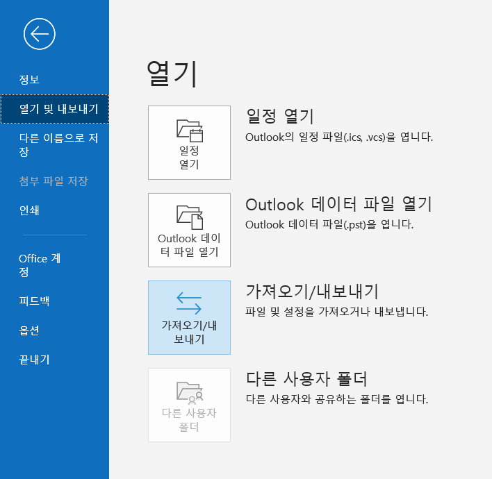 파일 -> 열기 및 내보내기 -> 가져오기/내보내기 항목을 선택합니다.