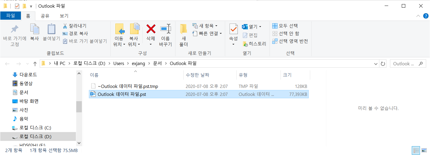 파일 위치 열기(O)로 띄운 Outlook 파일의 경로를 잘 기억해 두세요.