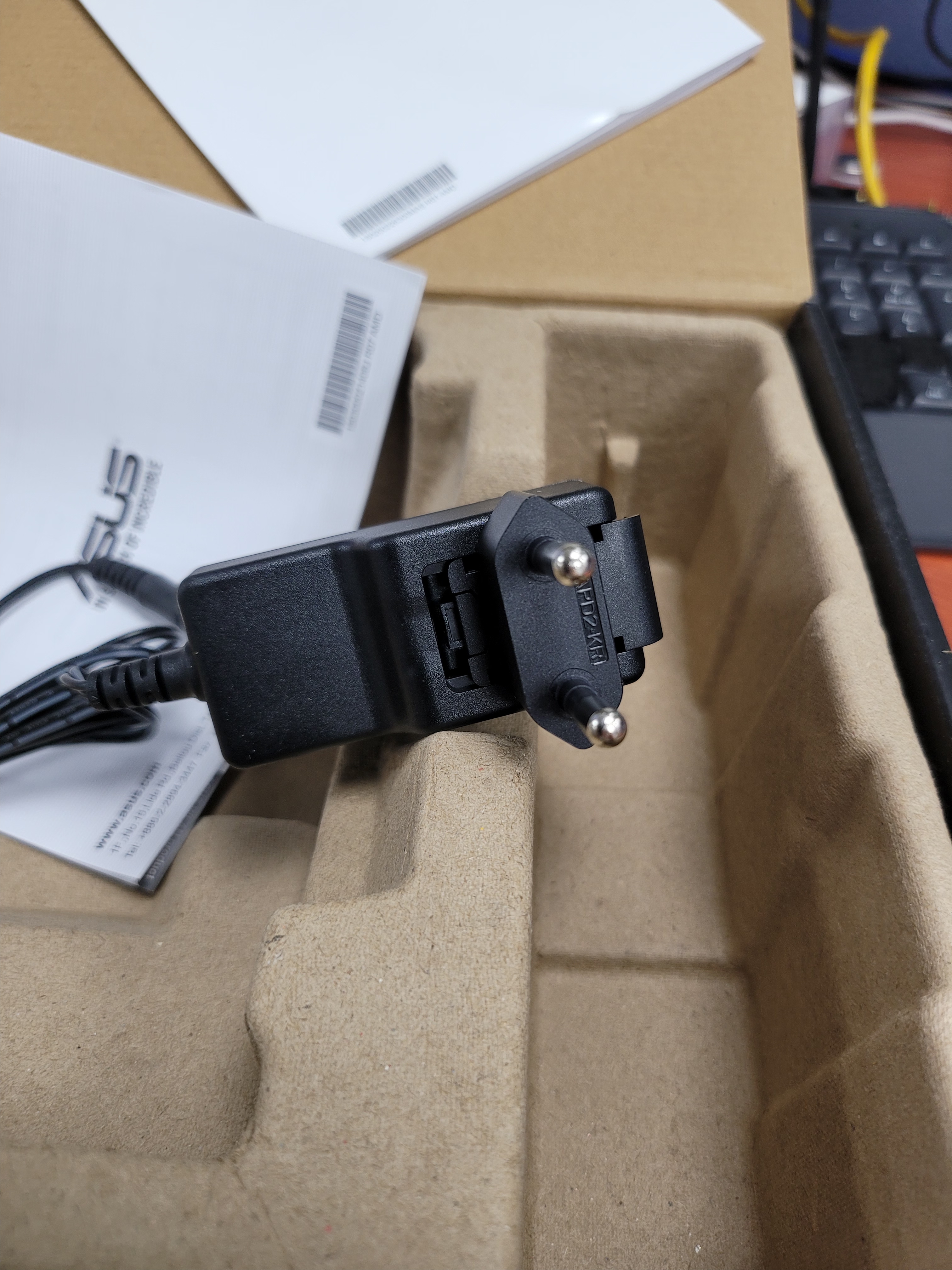 원래라면 ASUS 시리즈는 젠북 충전기와 비슷하게 생긴 19 볼트 90도 꺾인 어댑터가 들어있는데, 싸구려 공유기에 들어있는 저가형 12V 어댑터가 대신 들어있습니다.