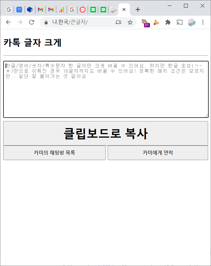 사이트에 원하는 내용을 입력하고 복사 버튼을 누른 뒤 카카오톡 대화창에 붙여 넣으세요.