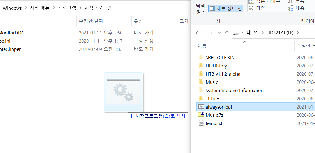 아까 만든 bat 배치 파일을 마우스 오른쪽(왼쪽 말고 오른쪽!!!) 버튼으로 끌어 시작프로그램 창에 드래그합니다.