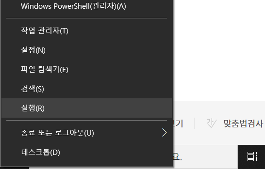 윈도우 아이콘을 오른 쪽 클릭해 실행(R)을 선택해주세요.