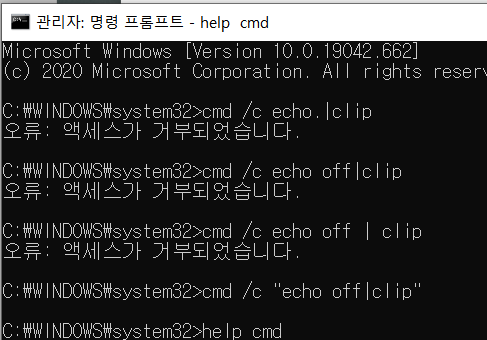 저 명령을 관리자 권한으로 실행해보세요.(따옴표 중요)