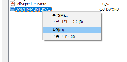 만약 이 문제를 가진 경우에는 DWMFRAMEINTERVAL 키를 삭제해보시면 도움이 될 수 있습니다.
