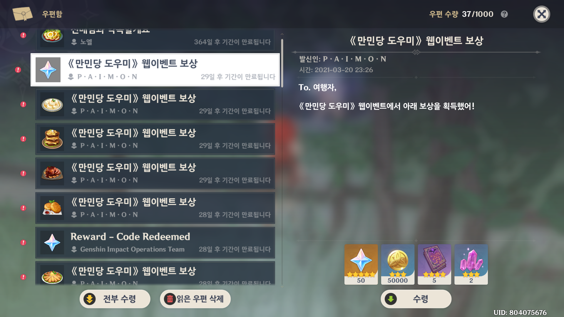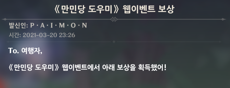 《만민당 도우미》 웹이벤트에서 아래 보상을 휙득했어!