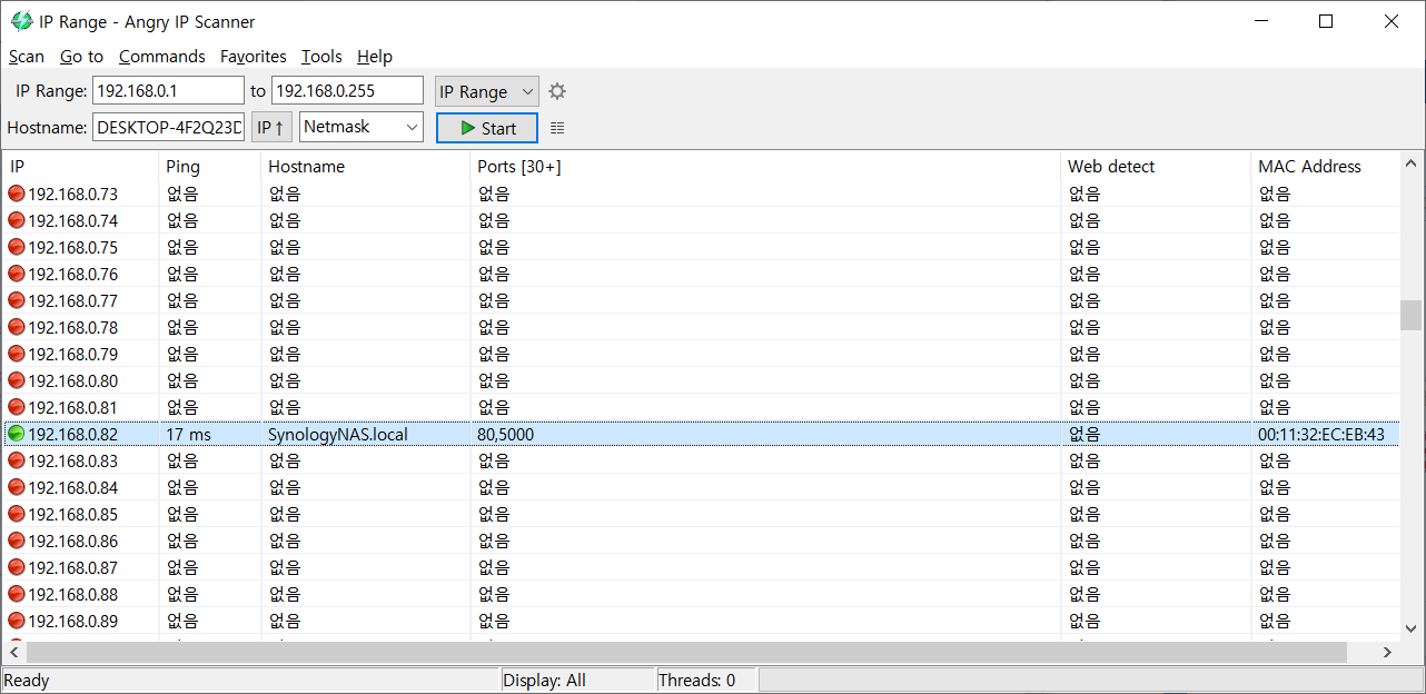 단, 시놀로지 NAS가 자신의 서브넷 밖에 있다면 검색이 힘들 수 있습니다.