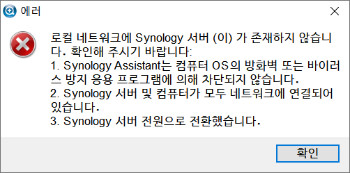 로컬 네트워크에 Synology 서버 (이) 가 존재하지 않습니다. 확인해 주시기 바랍니다:
