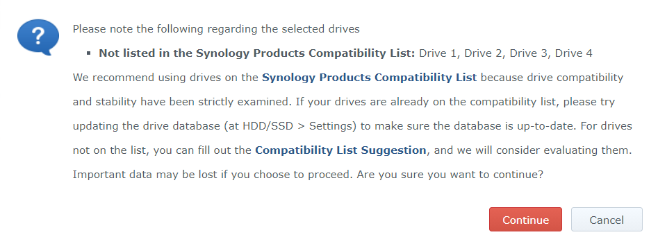 시놀로지에 HDD를 설치하다 보면 디스크 종류에 따라 저런 메세지가 표시됩니다.
