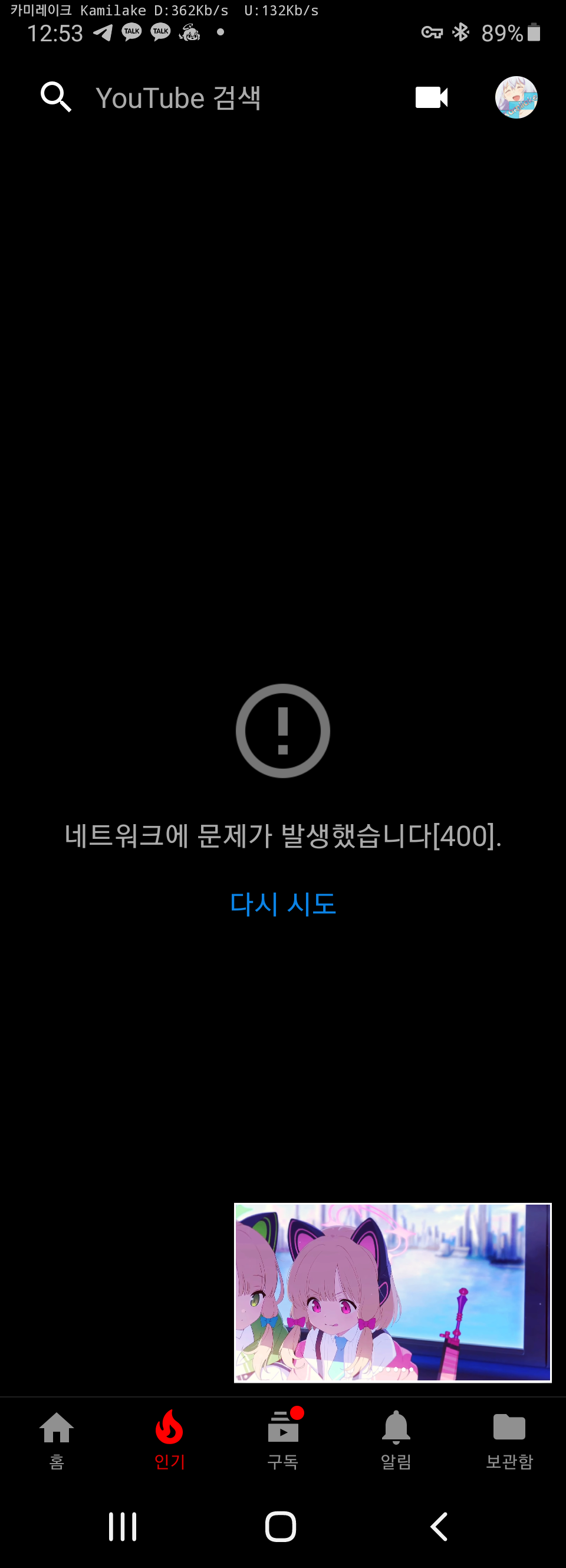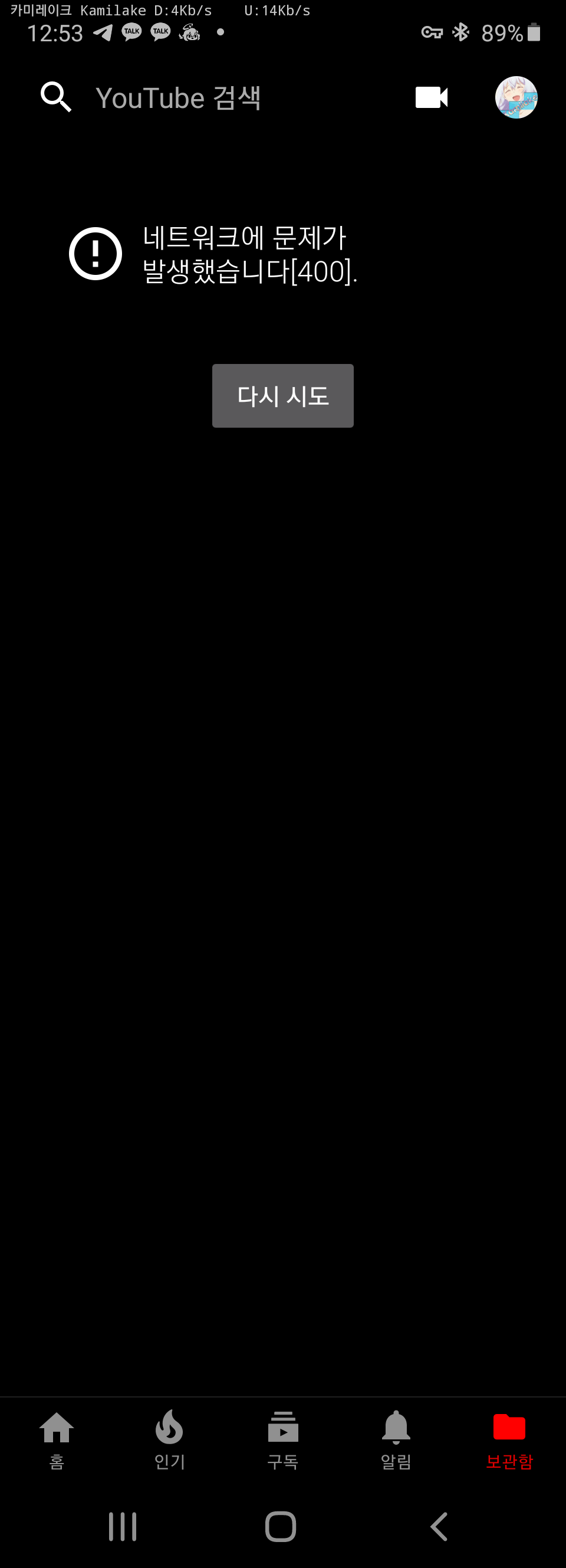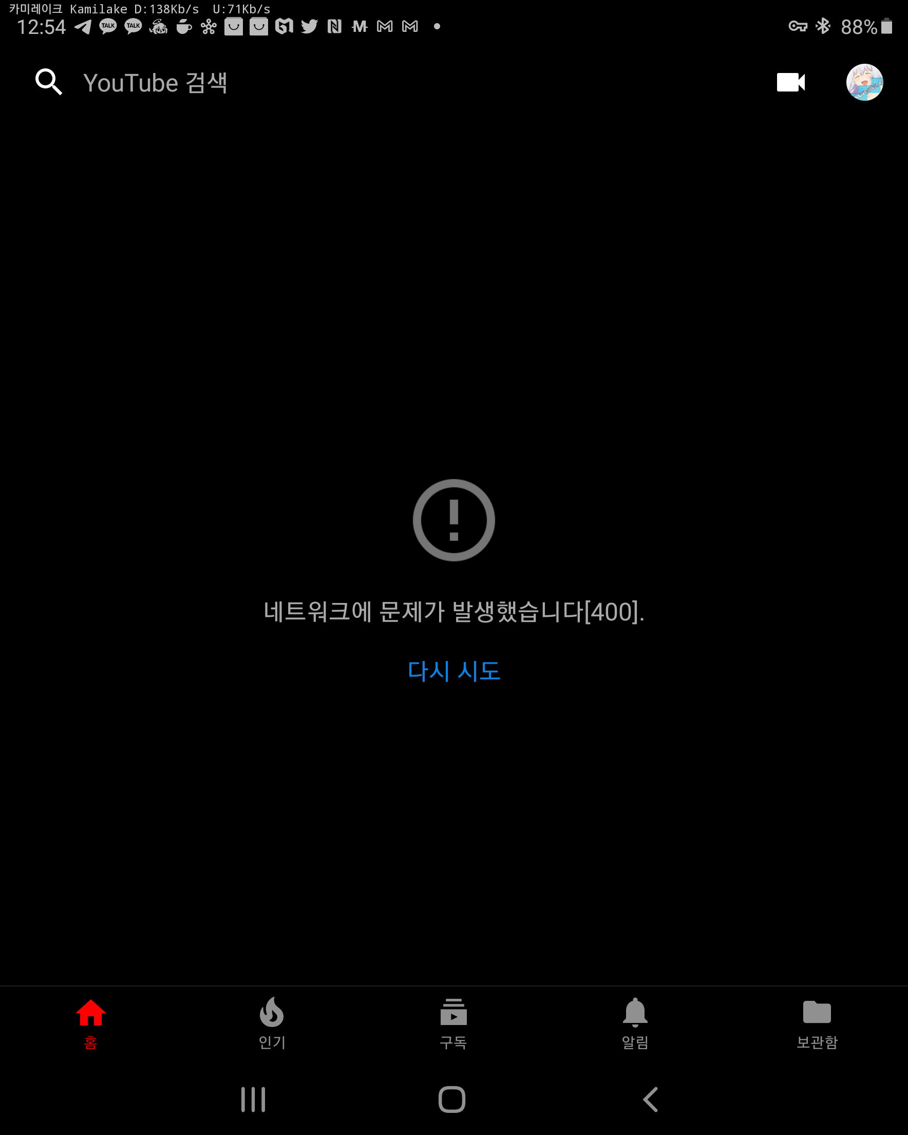 아까 점심뒤부터 계속 유튜브에서 네트워크에 문제가 발생했습니다[400] 오류가 나네요.. 서버 문제일까요?
