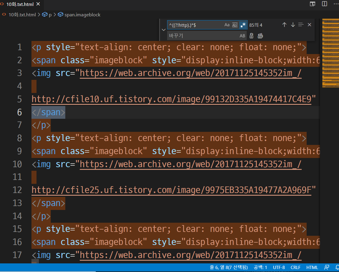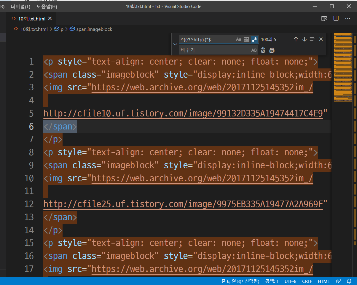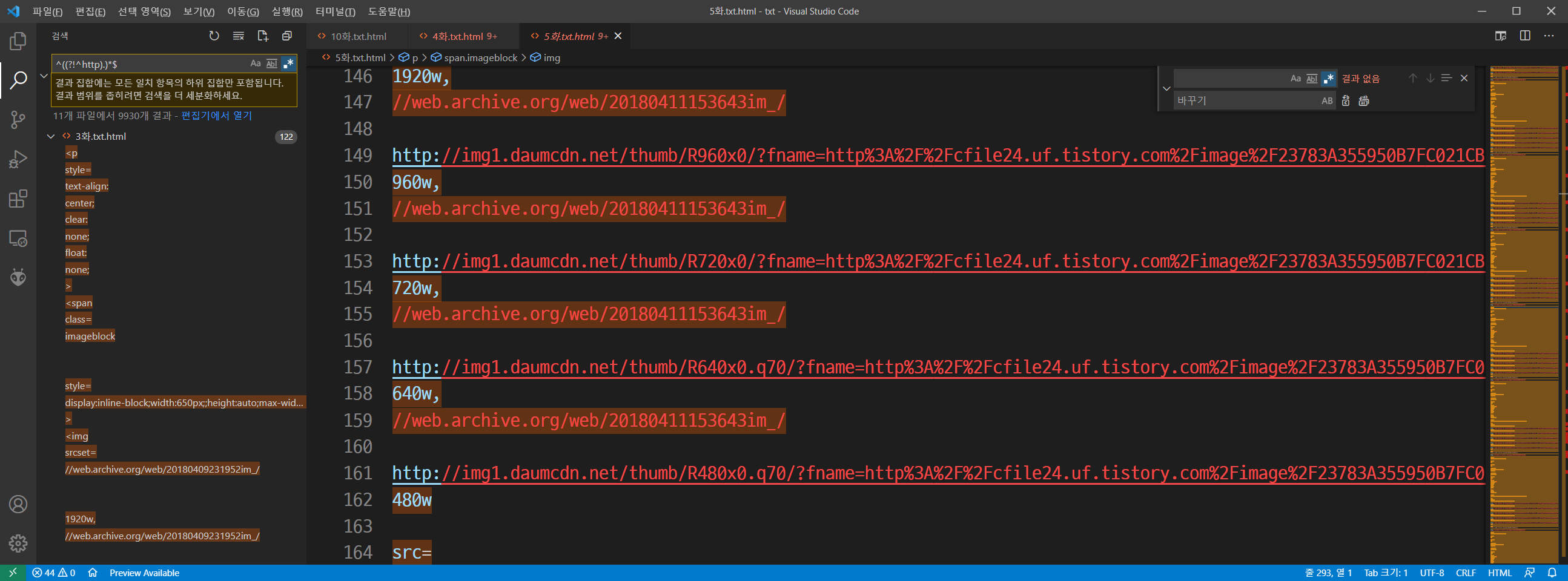 줄바꿈 대신 따옴표를 사용하면 vscode 정규식만을 사용해서 html에서 url을 추출할 수도 있습니다.