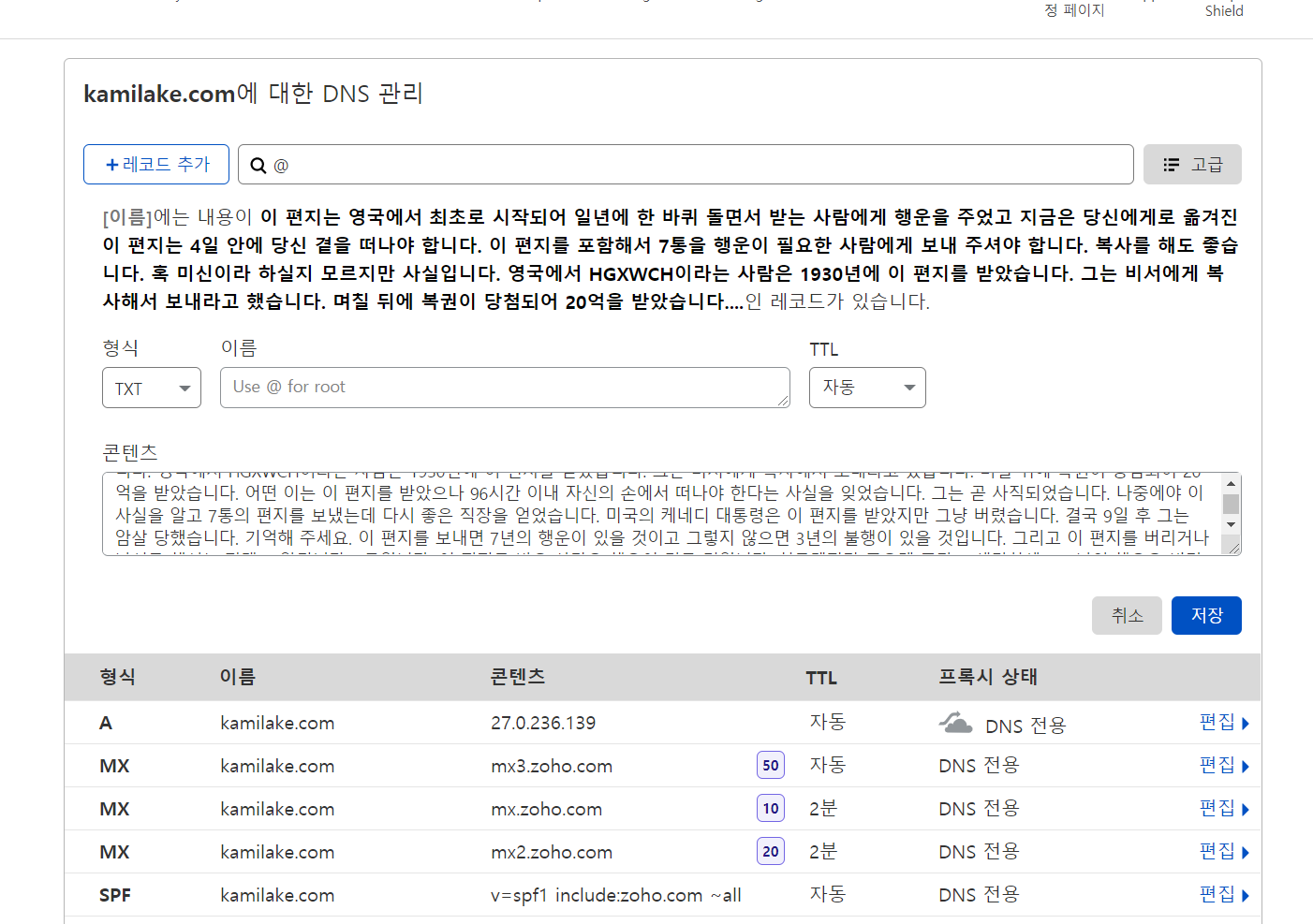자신의 DNS 관리 페이지에 엄청나게 긴 DNS가 있다면 줄이거나, 하위 도메인으로 쪼개거나, 삭제하면 됩니다.