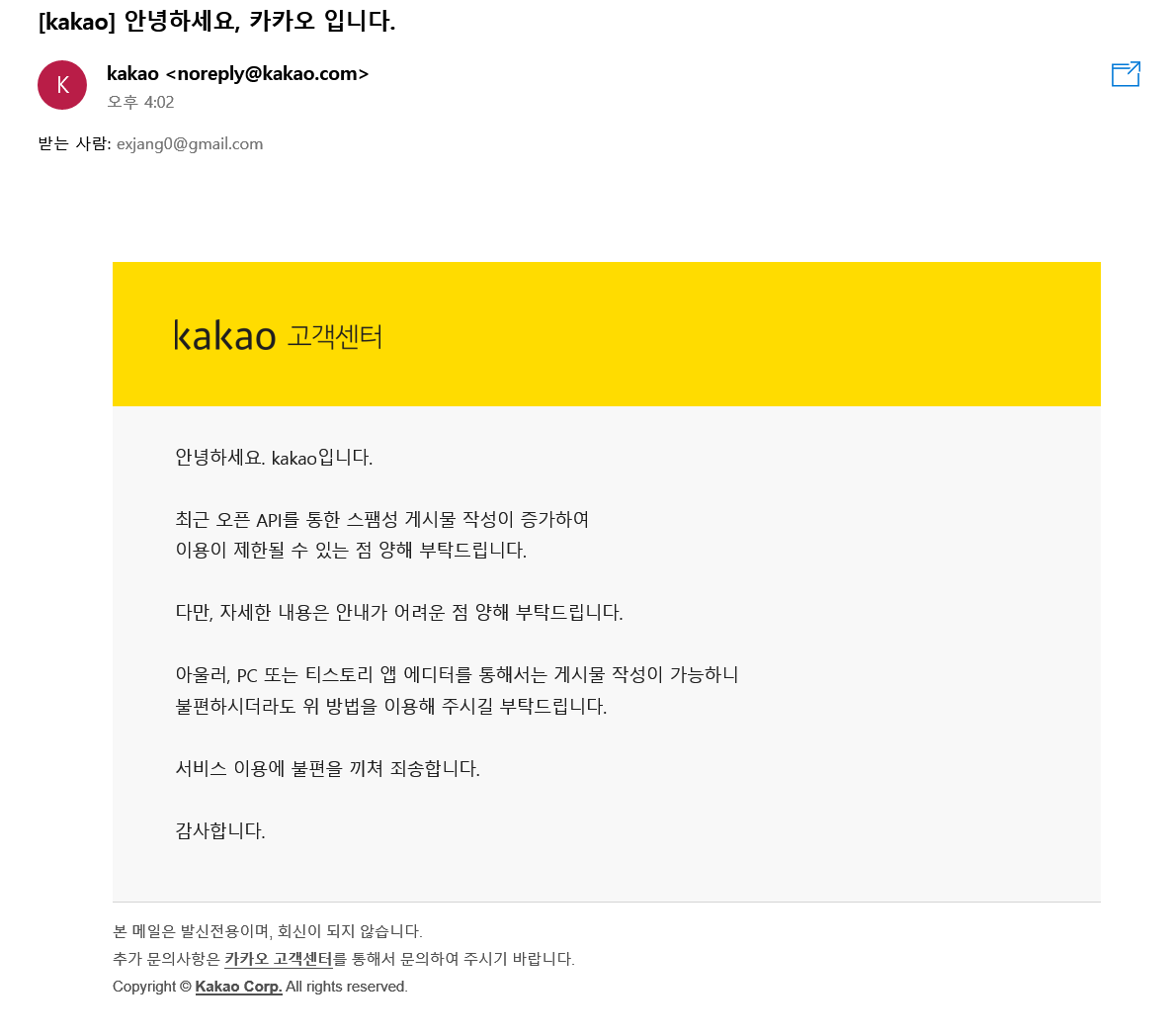 로봇 만들어 홍보글 적는 게 심해져서 제한을 걸었다는 카카오측 답변은 일단 이 부분과 상통하기에 사실이라 생각됩니다. 딱히 숨길 필요도 없어 보이구요