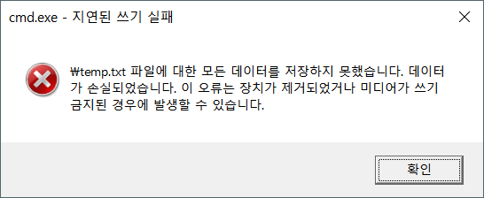 --------------------------- cmd.exe - 지연된 쓰기 실패 --------------------------- \temp.txt 파일에 대한 모든 데이터를 저장하지 못했습니다. 데이터가 손실되었습니다. 이 오류는 장치가 제거되었거나 미디어가 쓰기 금지된 경우에 발생할 수 있습니다. --------------------------- 확인 ---------------------------