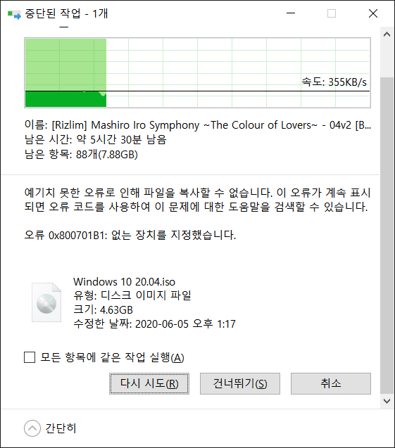 쓰기 캐시가 활성화된 상태에서 캐시를 장치가 아닌 Windows에서 관리할 때, 해당 장치가 너무 느리게 응답하거나 쓰기 도중에 장치를 분리하거나 하면 일정 시간이 지난 후 다음과 같은 메세지가 표시됩니다.
