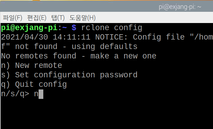 모든 설정이 완료되었습니다! q를 눌러 rclone을 빠져나오실 수 있습니다.