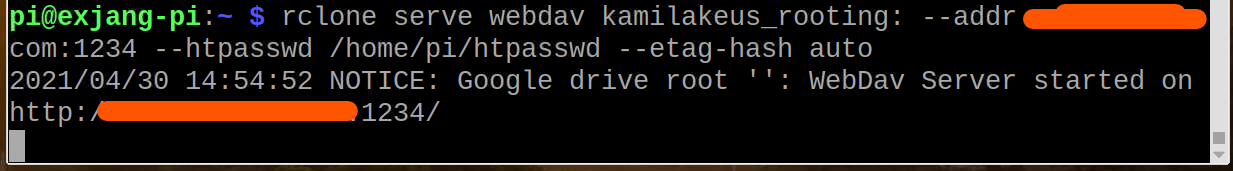 rclone serve webdav drive: --addr rclone.kamilake.com:1234 --htpasswd /home/pi/htpasswd --etag-hash auto