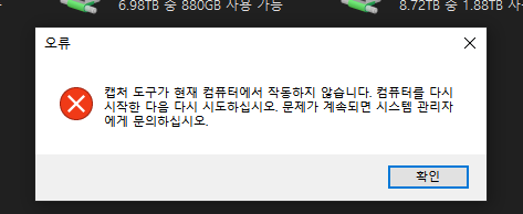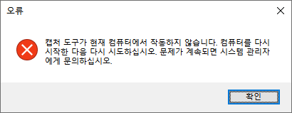 캡처 도구가 현재 컴퓨터에서 작동하지 않습니다. 컴퓨터를 다시 시작한 다음 다시 시도하십시오. 문제가 계속되면 시스템 관리자에게 문의하십시오.