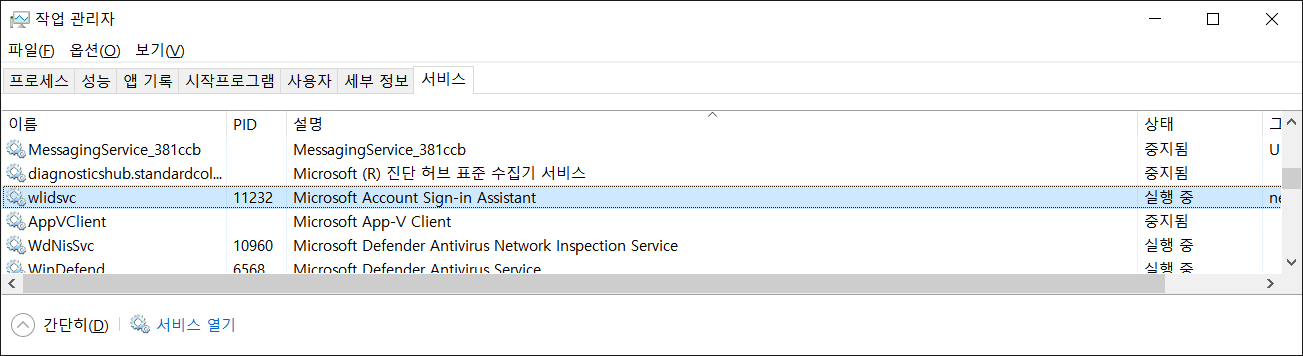 작업 관리자 -> 서비스 탭 -> Microsoft Account Sign-in Assistant