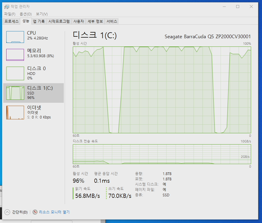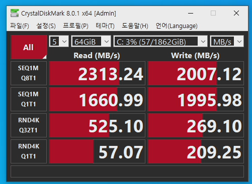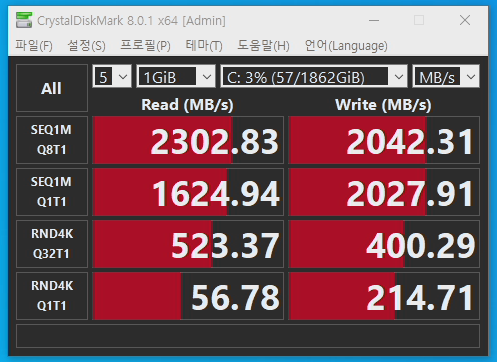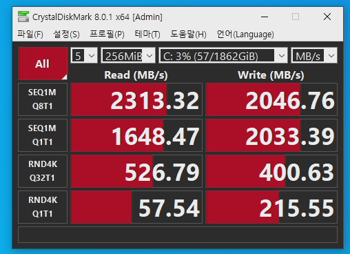제가 구입한 용량은 2TB 모델인데 모델별 속도차가 있다고 하니 측정 결과를 너무 믿지 말아주세요