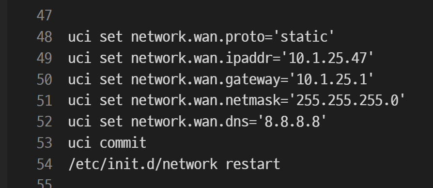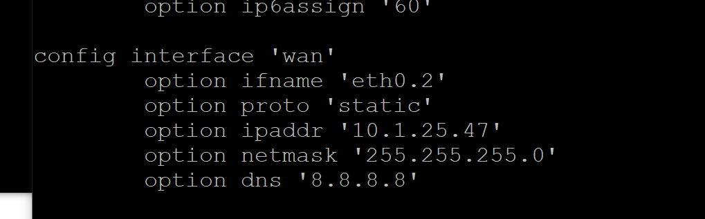 uci set network.wan.ipaddr='10.1.25.47'