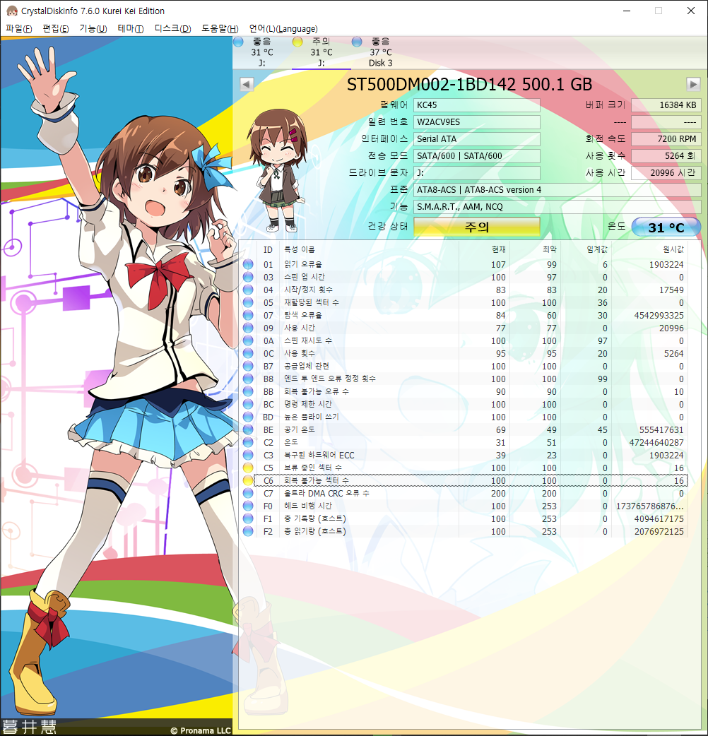C5, C6 항목을 보면 HDD의 암이라고도 불리는 배드 섹터에 관한 정보를 확인할 수 있습니다.