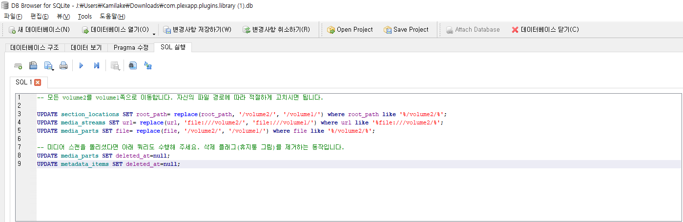 적절히 자신에 맞게 편집하신 후 DB 브라우저의 SQL 실행 탭에 붙여넣고 실행 버튼을 눌러주시면 됩니다.