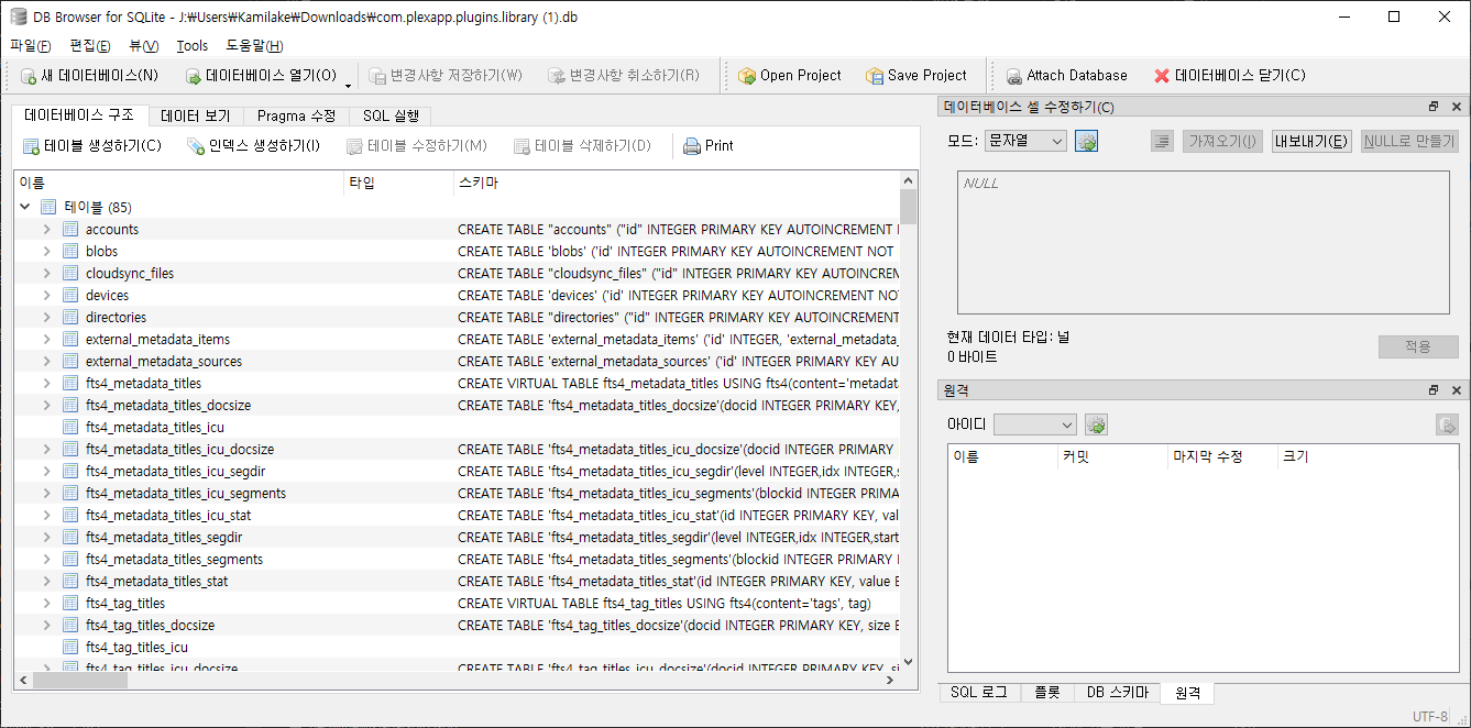 파일이 정상적으로 열리면 잡다한 테이블과 뷰 인덱스 등의 DB 구조를 볼 수 있습니다.