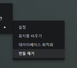 데이터베이스 최적화와 번들 제거를 눌러주시면 위 휴지통 라벨을 제거하면서 생긴 쓸모없는 파일을 모두 제거할 수 있습니다.