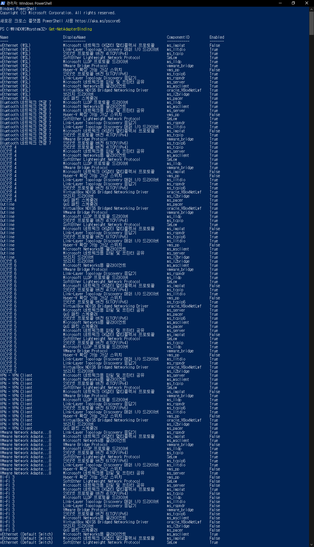여기 보이는 여러가지 어댑터는 이전에 GUI에서 삭제하려고 한 바인드된 프로토콜과 같은 모습입니다.