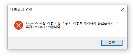 Hyper-V 확장 가능 가상 스위치 기능을 제거하지 못했습니다. 오류가 0x80071779입니다.