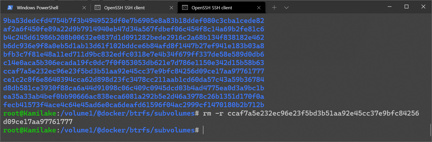 시놀로지 Docker를 BTRFS 파일시스템에서 사용할 경우 모종의 이유로 루트 폴더가 평범한 폴더가 되면서 삭제할 때 오류가 발생하지 않나 싶습니다. 도커를 수동으로 편집할 때 조심해야 할 것 같아요.